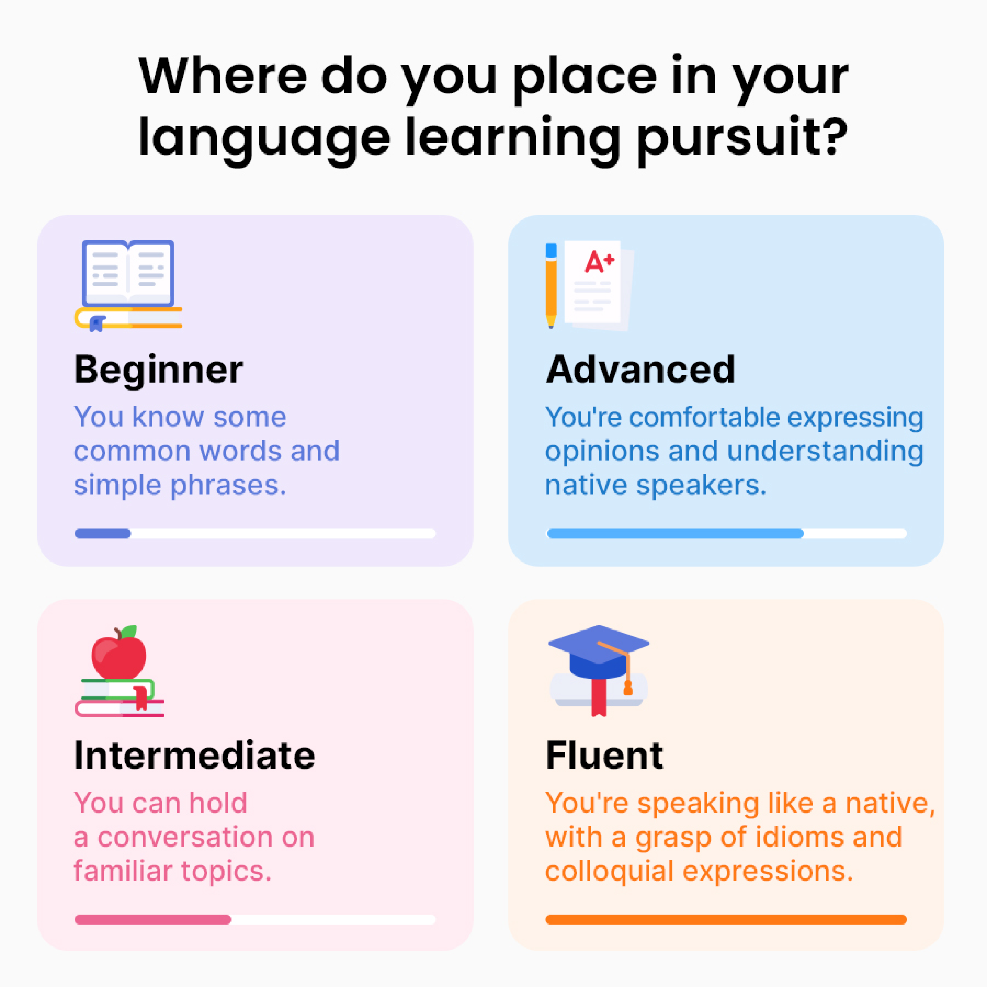 Language proficiency varies greatly among learners. It starts from beginner levels, where you might grasp basic greetings, to advanced fluency, where you’re discussing complex topics with ease. Here’s a breakdown of the stages: