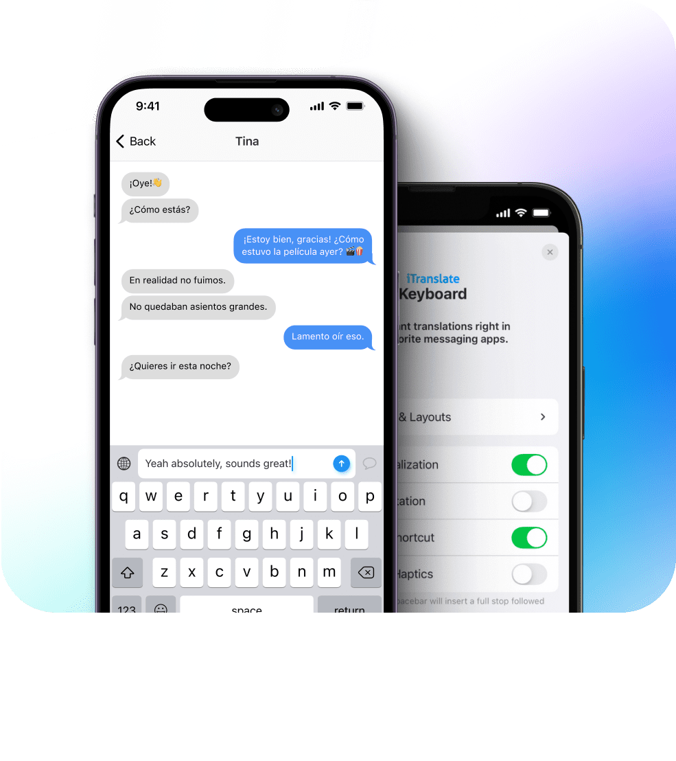 iTranslate's keyboard translator empowers you to step up your multilingual messaging game. Say goodbye to the hassle of switching apps — simply type, tap, and send messages in dozens of languages directly from your normal keyboard. Welcome to the new way of multilingual texting.